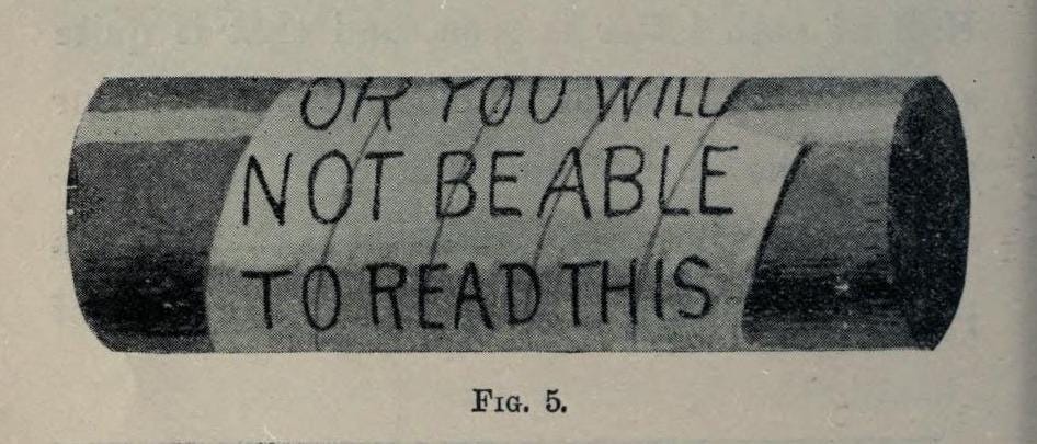 I love the above illustration from a book called Cryptography by Frederick Edward Hulme (1841–1909), an artist and naturalist. Here, Hulme shows a piece of paper that is wrapped around a certain size cylinder that allows the reader to decipher the message. If the cylinder is smaller or larger — or, if the prospective reader doesn’t recognize the feint — all you see are a bunch of lines or half letters.